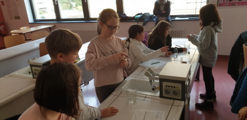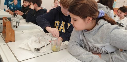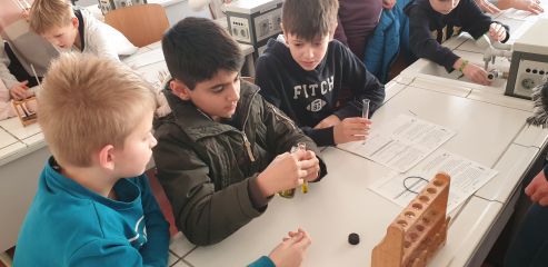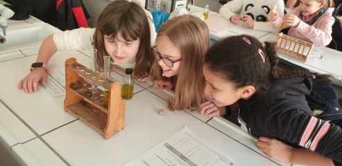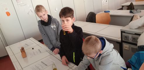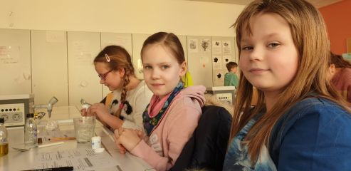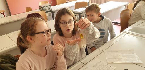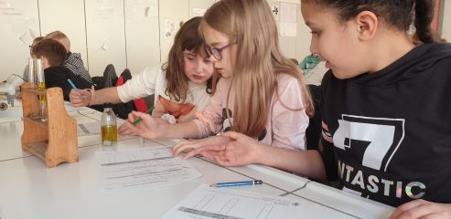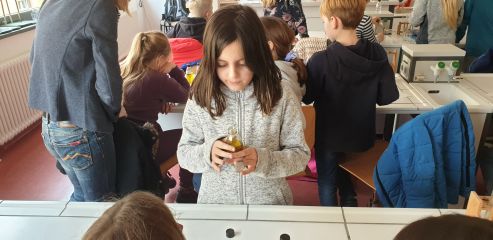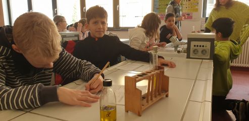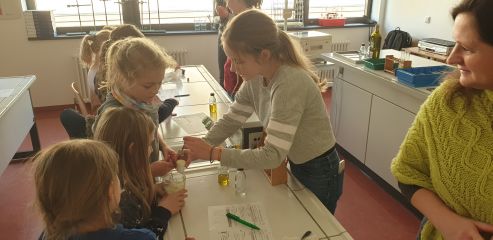 Der Übergang von der Grundschule zur weiterführenden Schule ist ein sehr aufregendes Thema. Um diesen großen Schritt zu erleichtern, hat das Schiller-Gymnasium mit der Harkortschule zwei gemeinsame Experimentier-Stunden organisiert und durchgeführt. Vom Schiller-Gymnasium plante Frau Schenkel in enger Absprache mit Herrn Hövelmann von der Grundschule die Stunden und führte diese jeweils für Teile der 4a und 4b durch. Gemeinsam mit Schülerinnen und Schülern der Profil-AG Naturwissenschaften experimentierten die Viertklässler mit Öl und Wasser und erkannten, dass eine Mischung dieser Flüssigkeiten nicht möglich ist. Erst durch die Zugabe eines Emulgators konnte eine Creme hergestellt werden, die die Kinder als Handcreme sogar nutzen können.