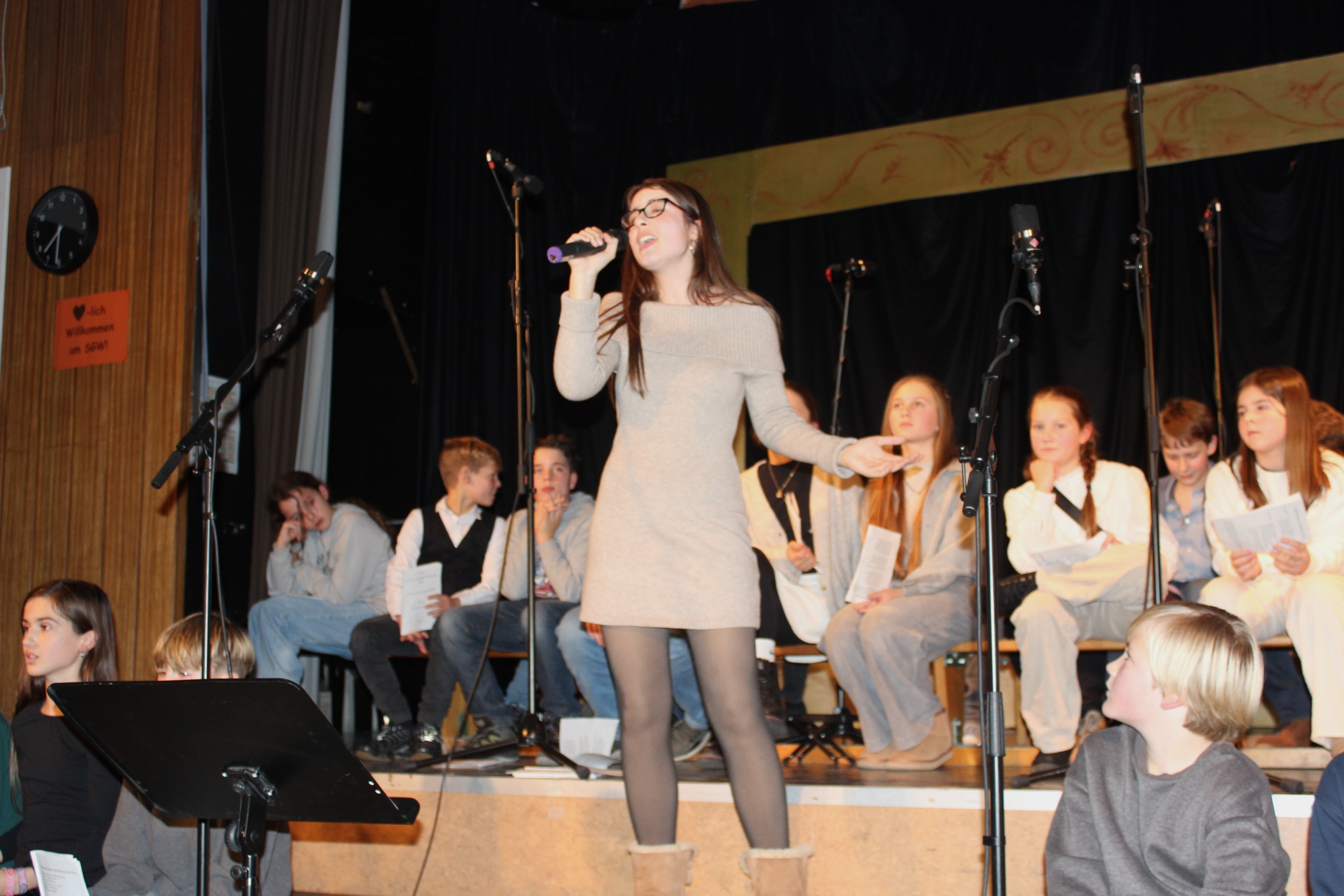 So geschehen am 10.12.2024 beim Adventskonzert, das dieses Jahr wieder in der voll besetzten Aula des SGW stattfand. Schüler:innen des 5. Jahrgangs bis zur Q1 zeigten auf der Bühne, was sie einzeln, im Duett oder im Chor einstudiert hatten. Daraus entstand ein zweistündiges, hochkarätiges Programm, das die Zuhörer bis zur letzten Minute fesselte und sie zu frenetischem Applaus hinriss. Zudem sangen die Gäste viele der Advents- und Weihnachtslieder lautstark mit, sodass der Gesang von der Bühne mit dem aus dem Saal zu einem großen Gemeinschaftsklang verschmolz. Schulgemeinschaft durch Rudelsingen – mal was anderes.